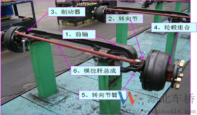 3、前橋構(gòu)造:前橋主要由前軸、主銷、轉(zhuǎn)向節(jié)、制動器總成、輪轂組合、節(jié)臂、橫拉桿總成等組成。(如下圖)